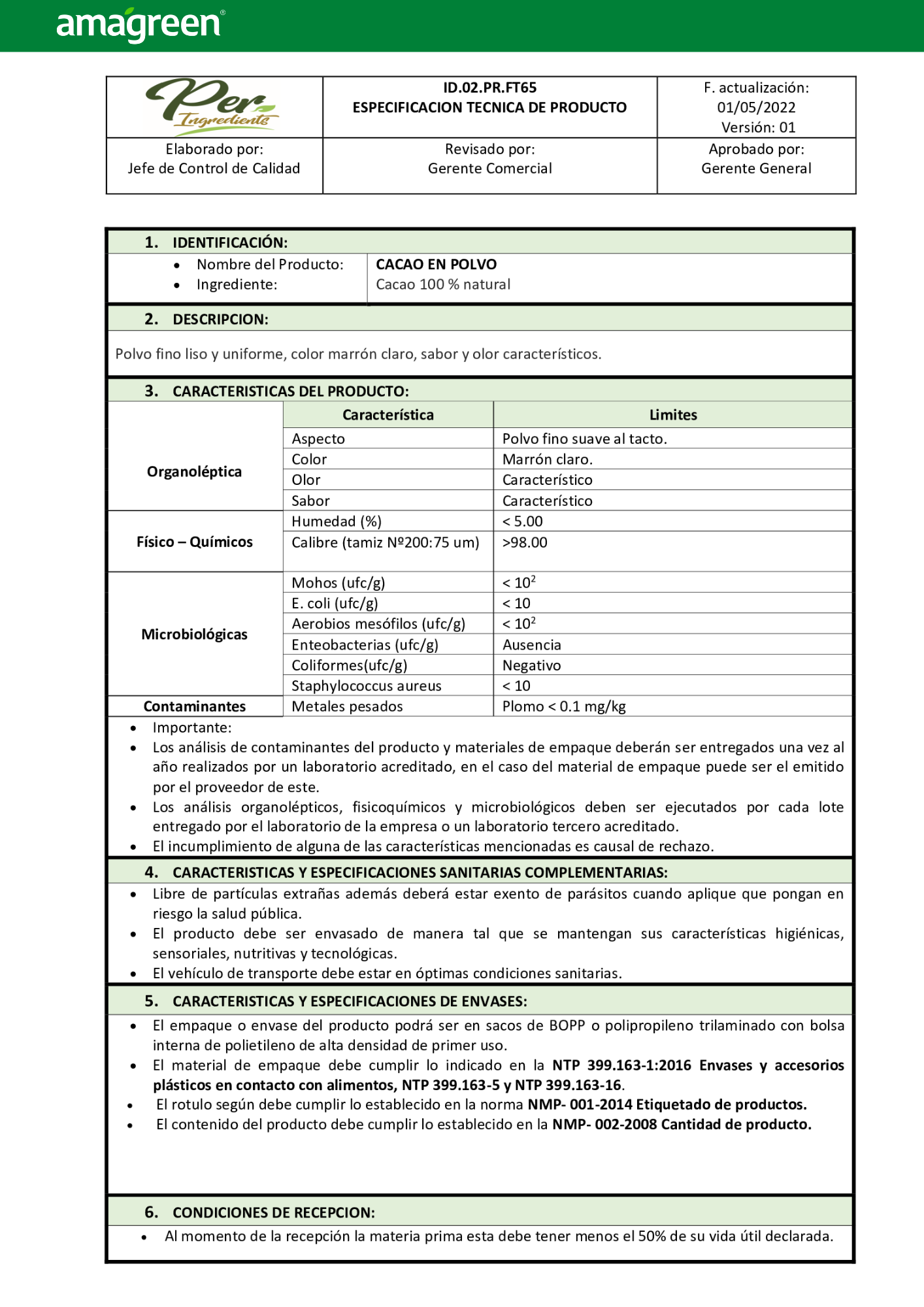 Beneficios: Cacao amargo natural, 100% puro sin agregado de azúcar ni colorantes. Brinda propiedades antioxidantes, previniendo deterioro celular. Es estimulante, favorece la liberación de endorfinas, generando sensación de bienestar. Práctico al momento de incluirlo en preparaciones de repostería. Resulta un cacao con una excelente aceptación al paladar, un color más intenso y de mayor presencia.