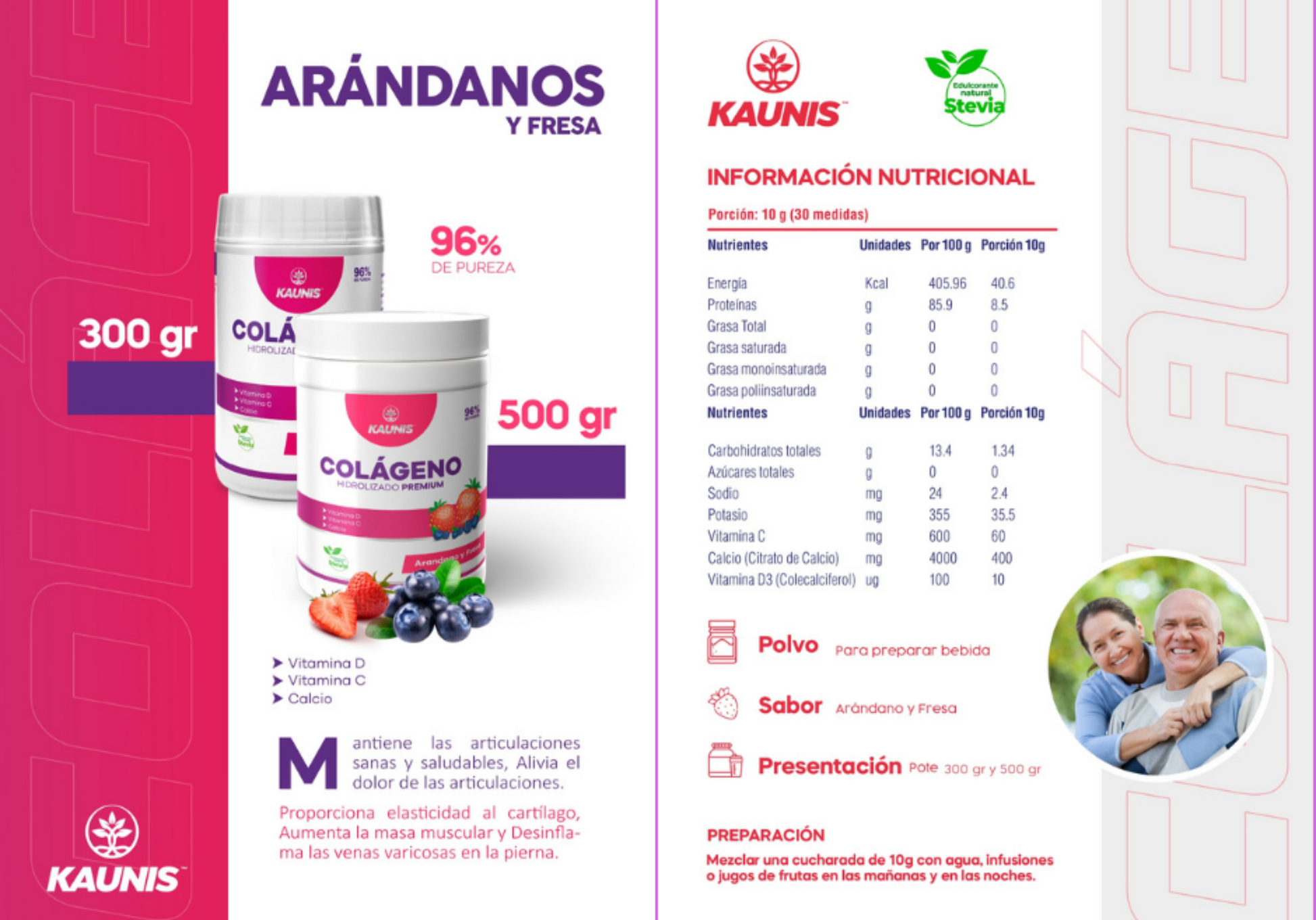 Suplemento en polvo a base de Colágeno Hidrolizado, Vitamina D, Vitamina C y Calcio. Con sabor natural de Arandano y Fresa, endulzado con Stevia.